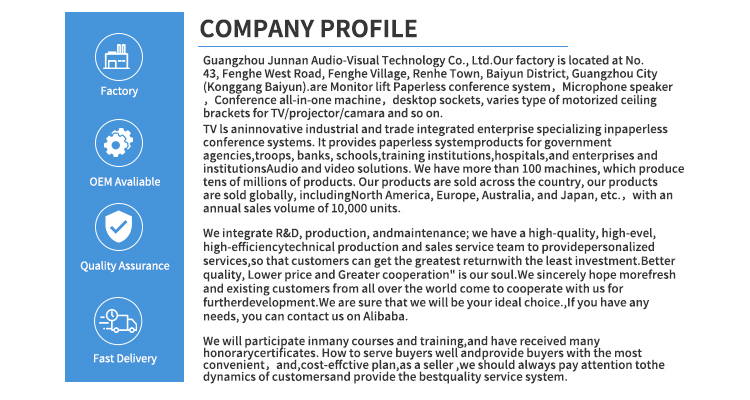 उन्नत इलेक्ट्रिक OLED स्क्रिन एलसीडी मनिटर लिफ्टर मोनिटरहरू सबै प्रकारका दृश्यहरूको लागि उपयुक्त छन्, हामीसँग सीएनसी मेसिन काट्ने प्रविधि र लेजर प्रविधि छ, उत्पादन अल्ट्रा-उच्च मापदण्डहरू सुनिश्चित गर्न नवीनतम सम्मेलन तालिका एलसीडी स्क्रिन लिफ्टर प्रविधि छ। हाम्रा सबै OLED स्क्रिन एलसीडी लिफ्टरहरू मेड इन चाइनाका हुन्, थोक खरिदका लागि उपलब्ध छन्, ग्राहकहरूको लागि निजी रूपमा अनुकूलित गर्न सकिन्छ, र स्टकमा पर्याप्त इलेक्ट्रिक टच स्क्रिन एलसीडी मोनिटर लिफ्टरहरू छन् जुन ग्राहकहरूलाई छिटो डेलिभरी समर्थन गर्दछ। र हाम्रो जुन्न उपकरणसँग विभिन्न प्रकारका प्रमाणपत्रहरू छन् जस्तै CCC, CE प्रमाणपत्र, ROHS, ISO प्रमाणीकरण, उत्पादन सुरक्षित र उच्च गुणस्तरको छ, निर्यात योग्यताको साथ, अनुकूल मूल्यको साथ प्रत्यक्ष कारखाना हो, यसको आफ्नै कारखाना छ र धेरै वर्षदेखि सञ्चालन भइरहेको छ।